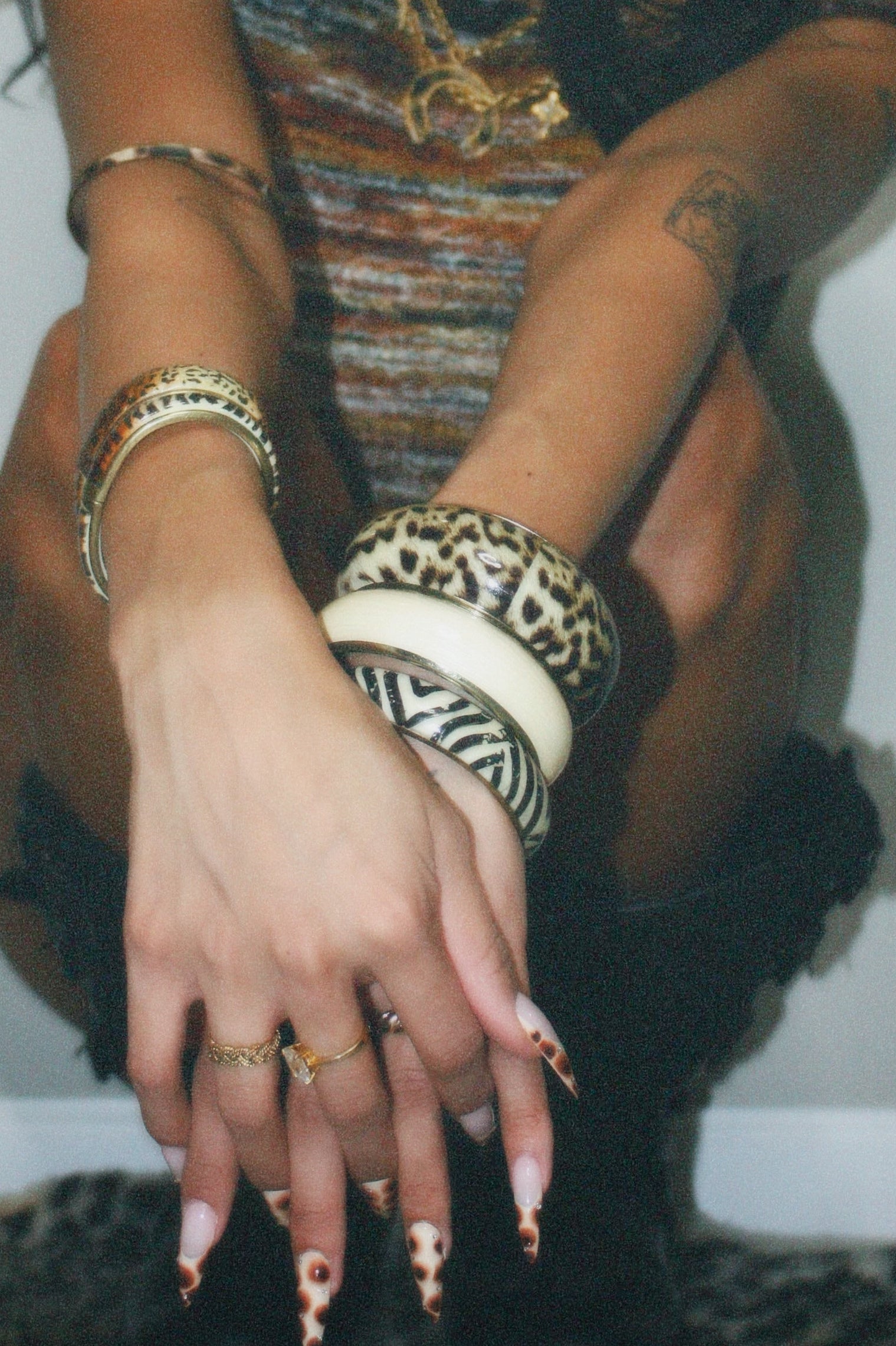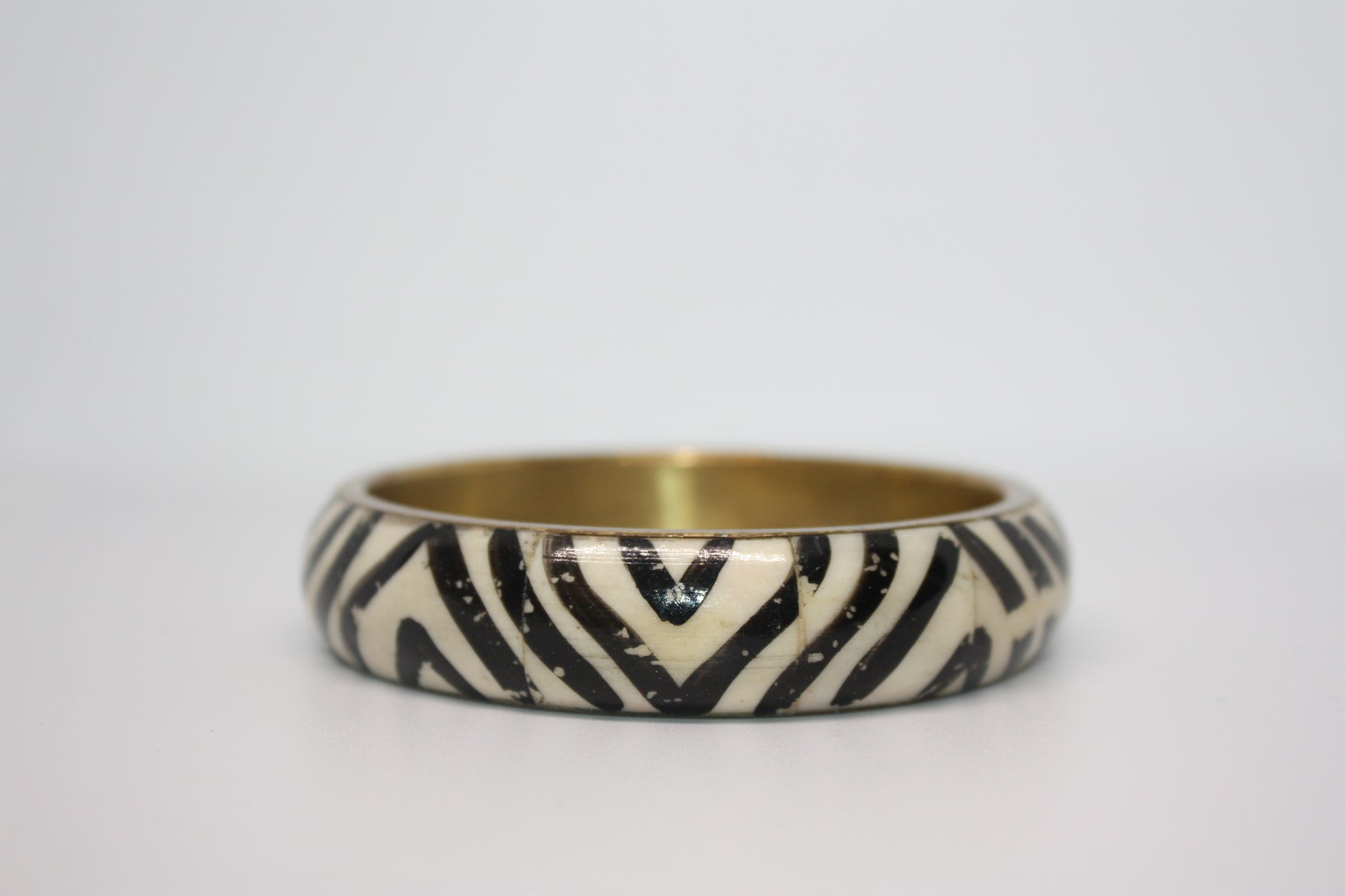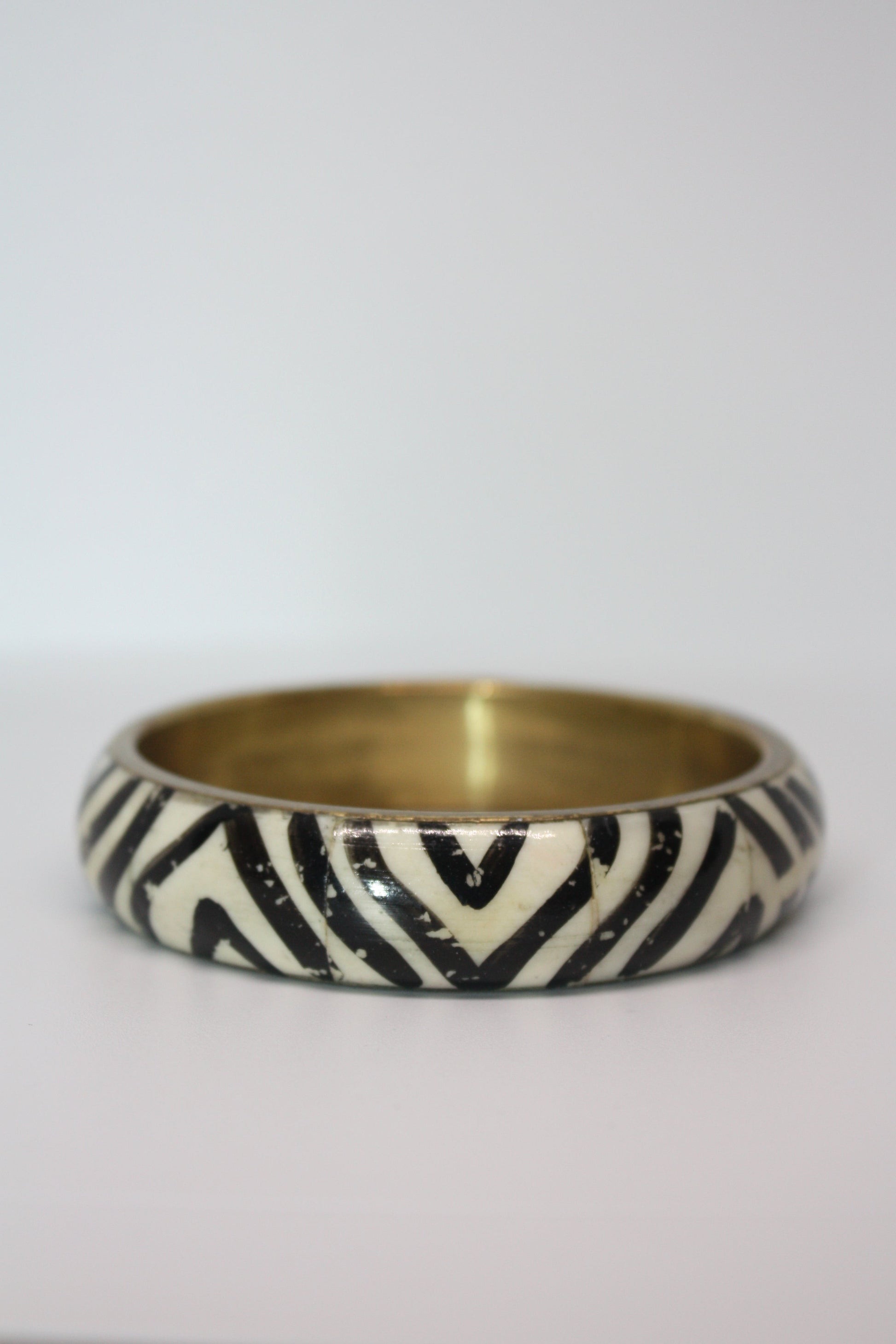 A chunky printed bangle featuring a black and ivory abstract stripe pattern. This piece adds bold contrast to any outfit and layers effortlessly.