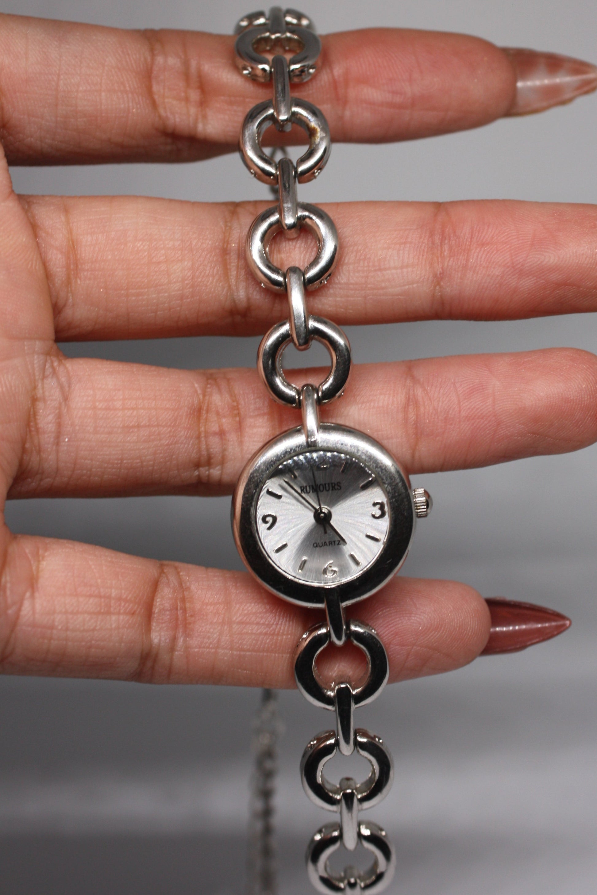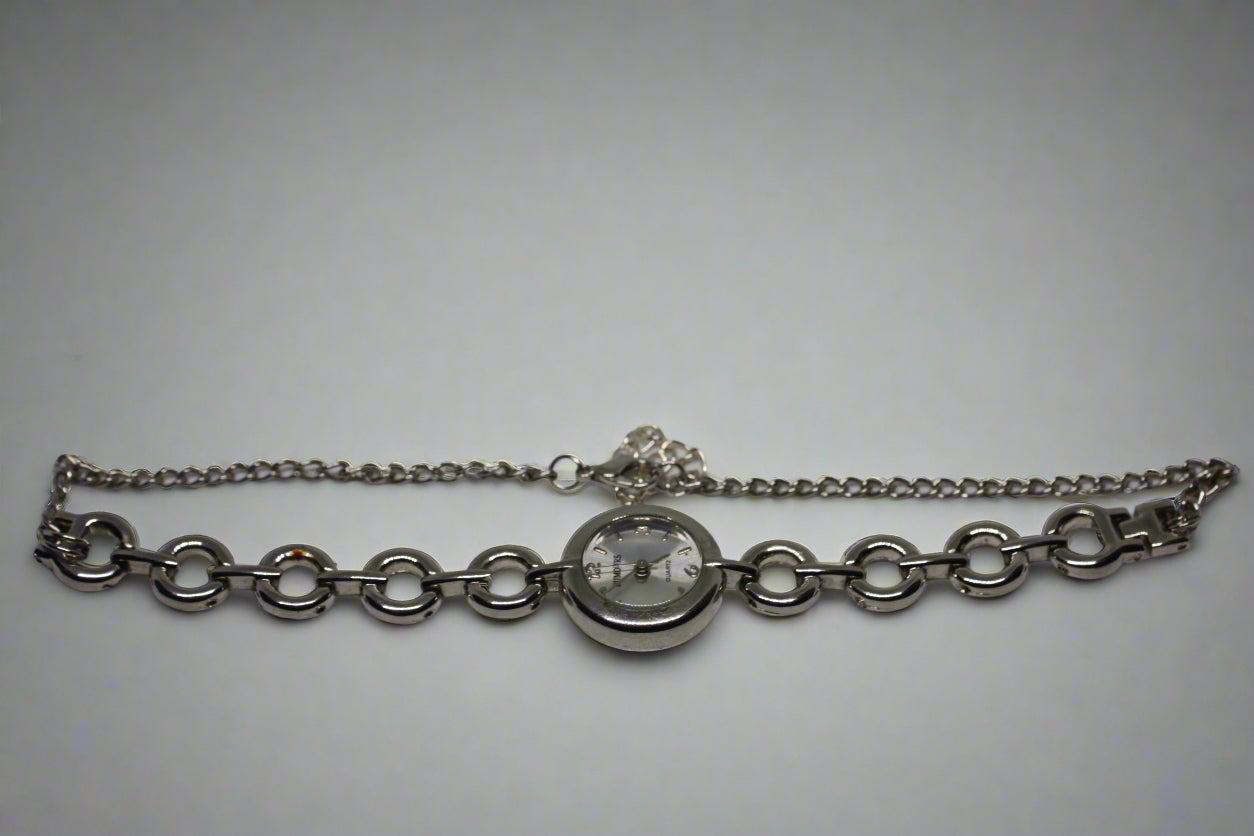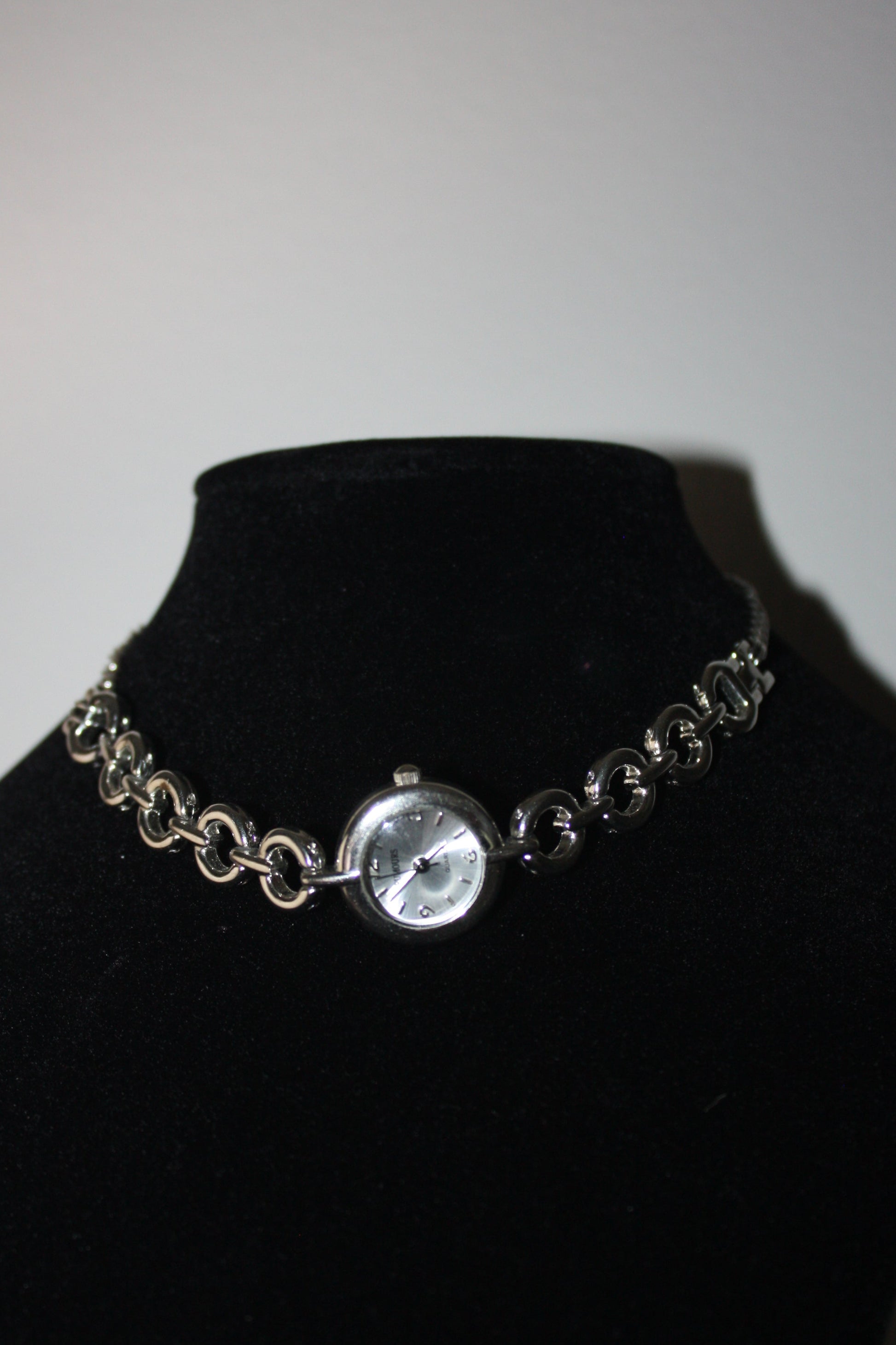 The Default chocker is such a simple and sleek, yet bold piece. Chunky hardware links meet a clean silver face for a bold and polished wearable statement. One-of-a-kind, non functioning watch face.