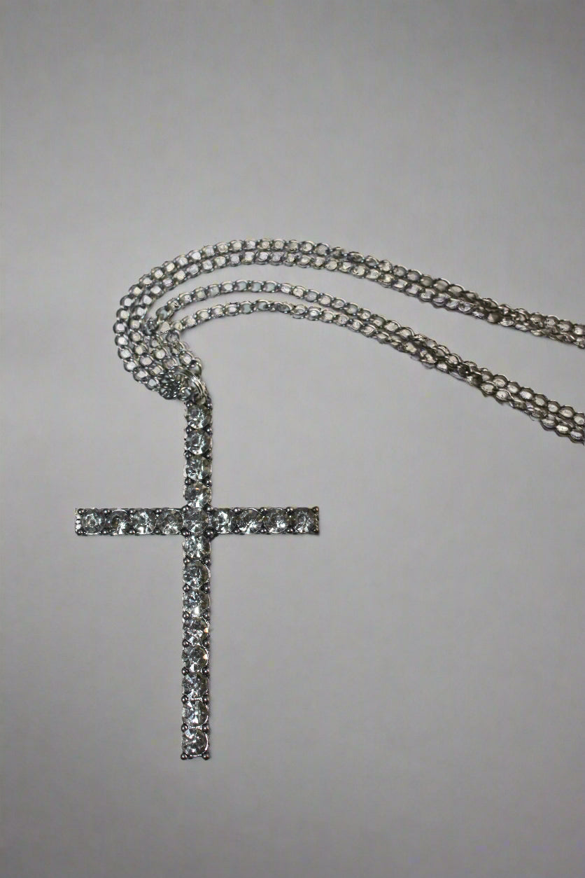 The Double Diamond necklace is a statement piece that SCREAMS! An encrusted oversized cross pendant layered on a double silver chain. This necklace is everything between glamour and edge. Wear it alone for a spotlight moment, or stacked with other pieces for a sick statement stack.