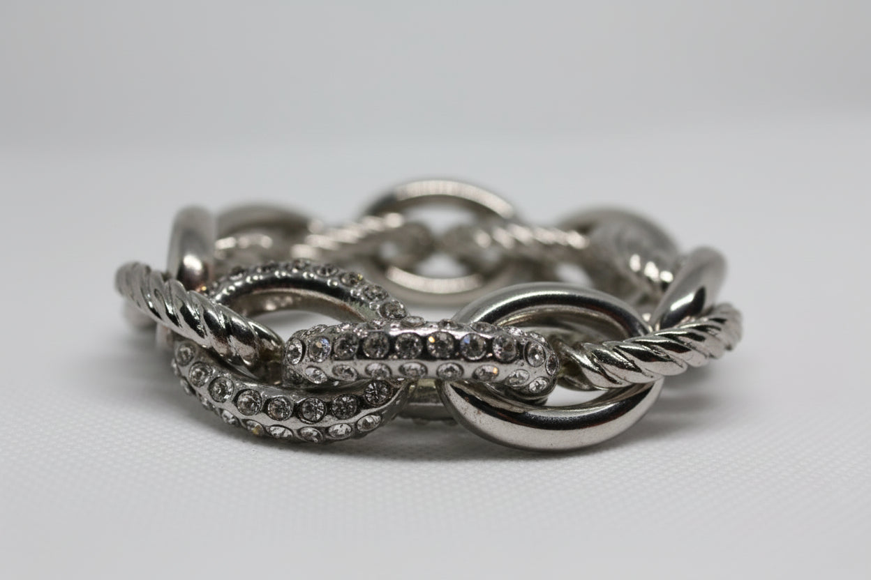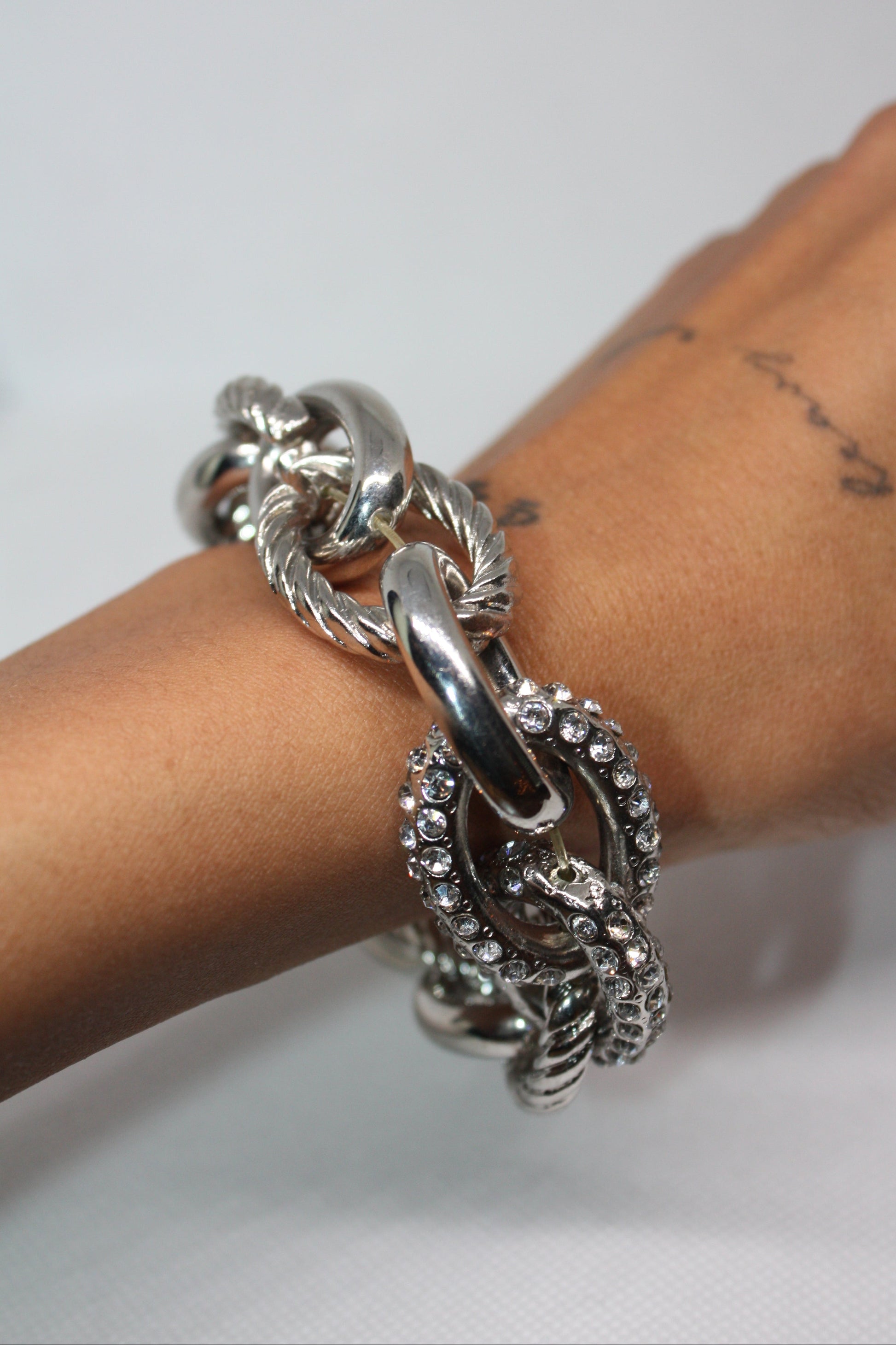 This heavy-weight silver chain bangle is SO iconic! Twisted, rope textured links, smooth sleek links, and 2 rhinestone drenched links, layered to make this luxe, glam, and clean statement bracelet.