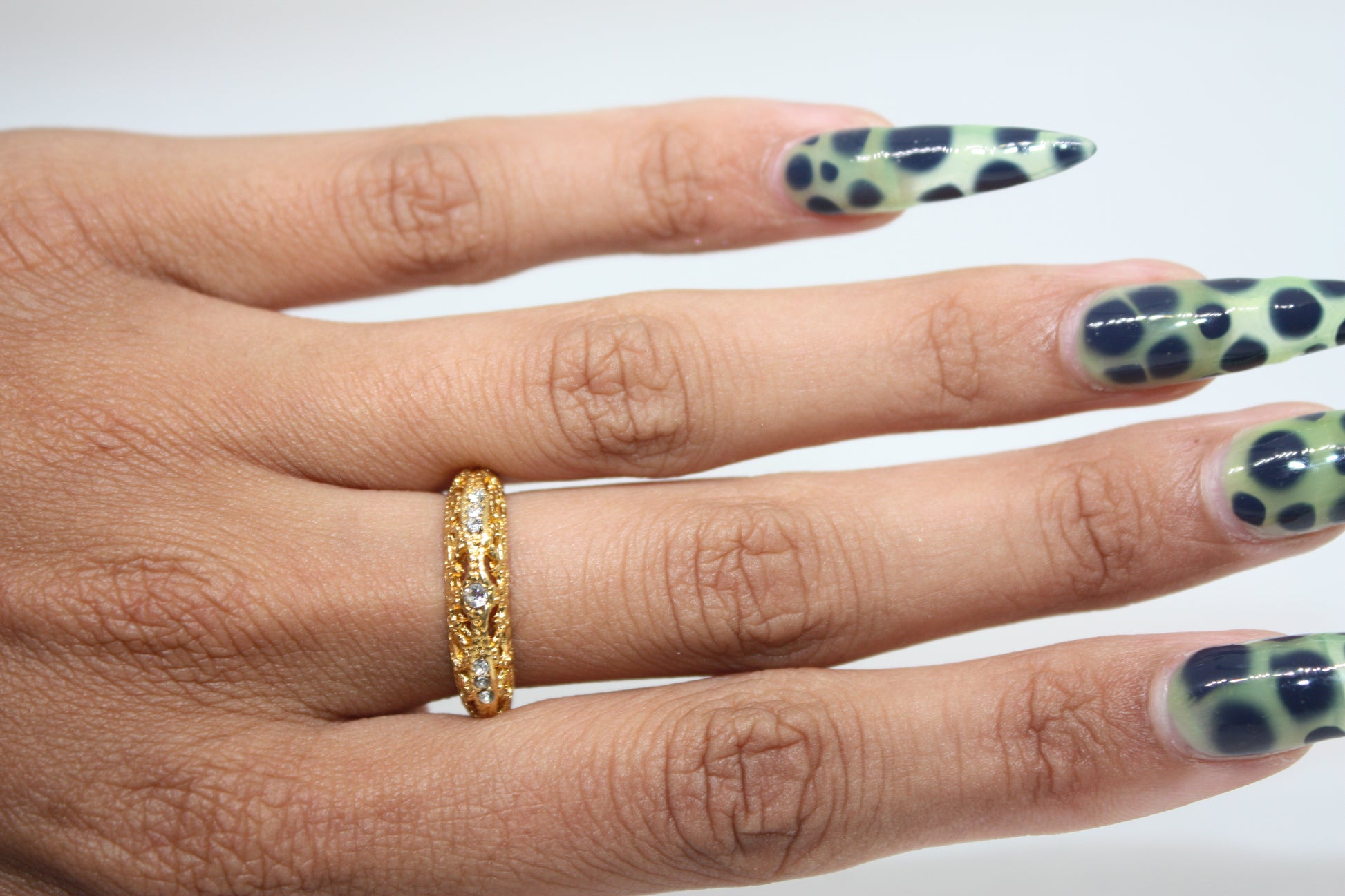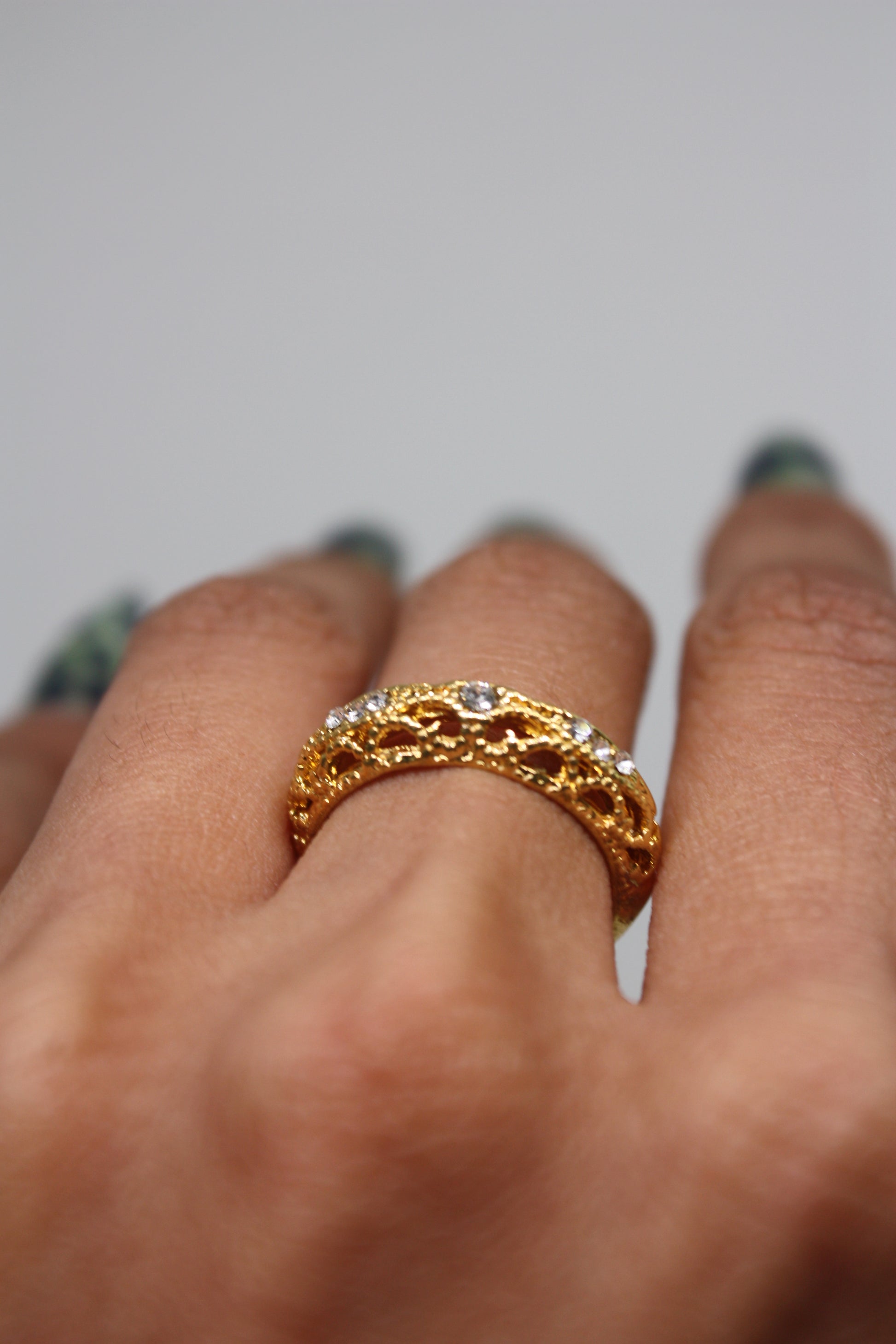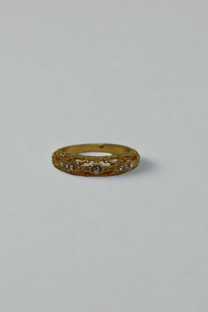 Vintage gold band with textured detail, stone accents, and gorgeous finish. The perfect balance of timeless and glam to add to your vanity!