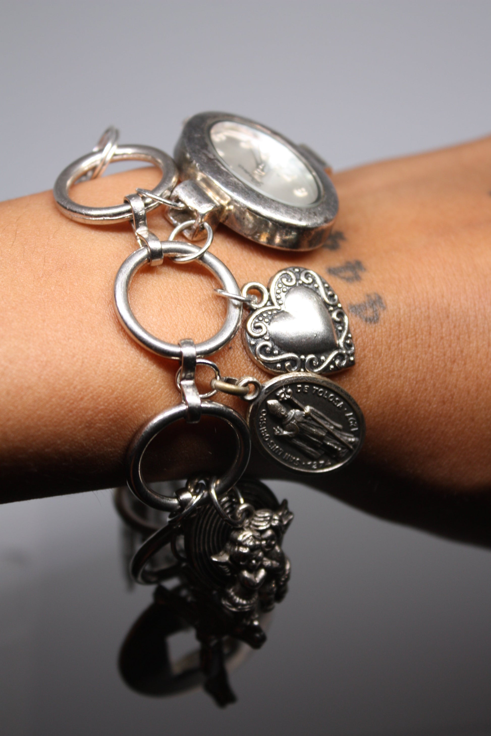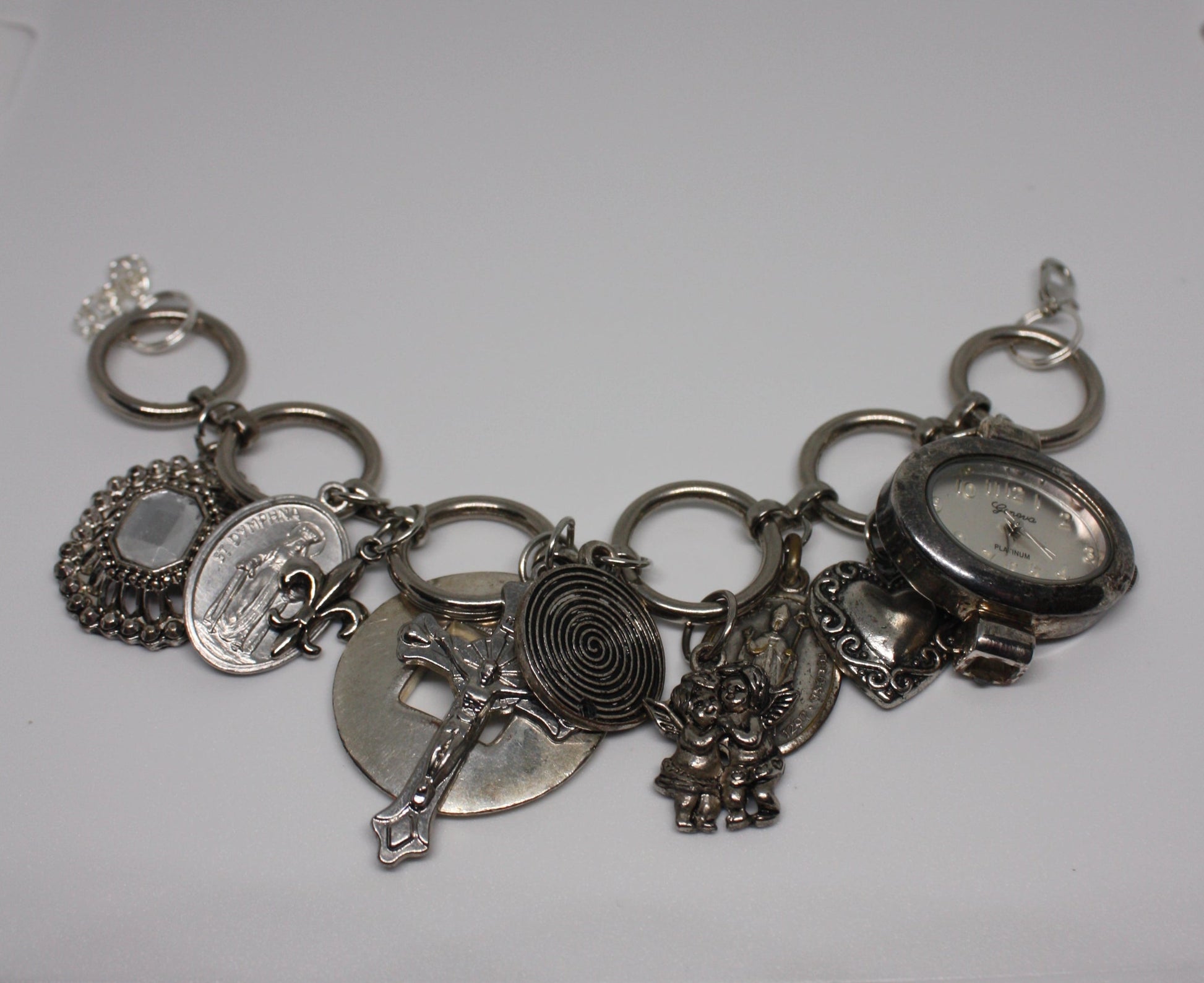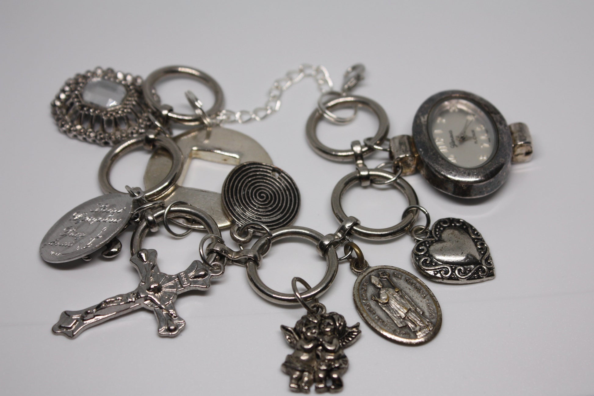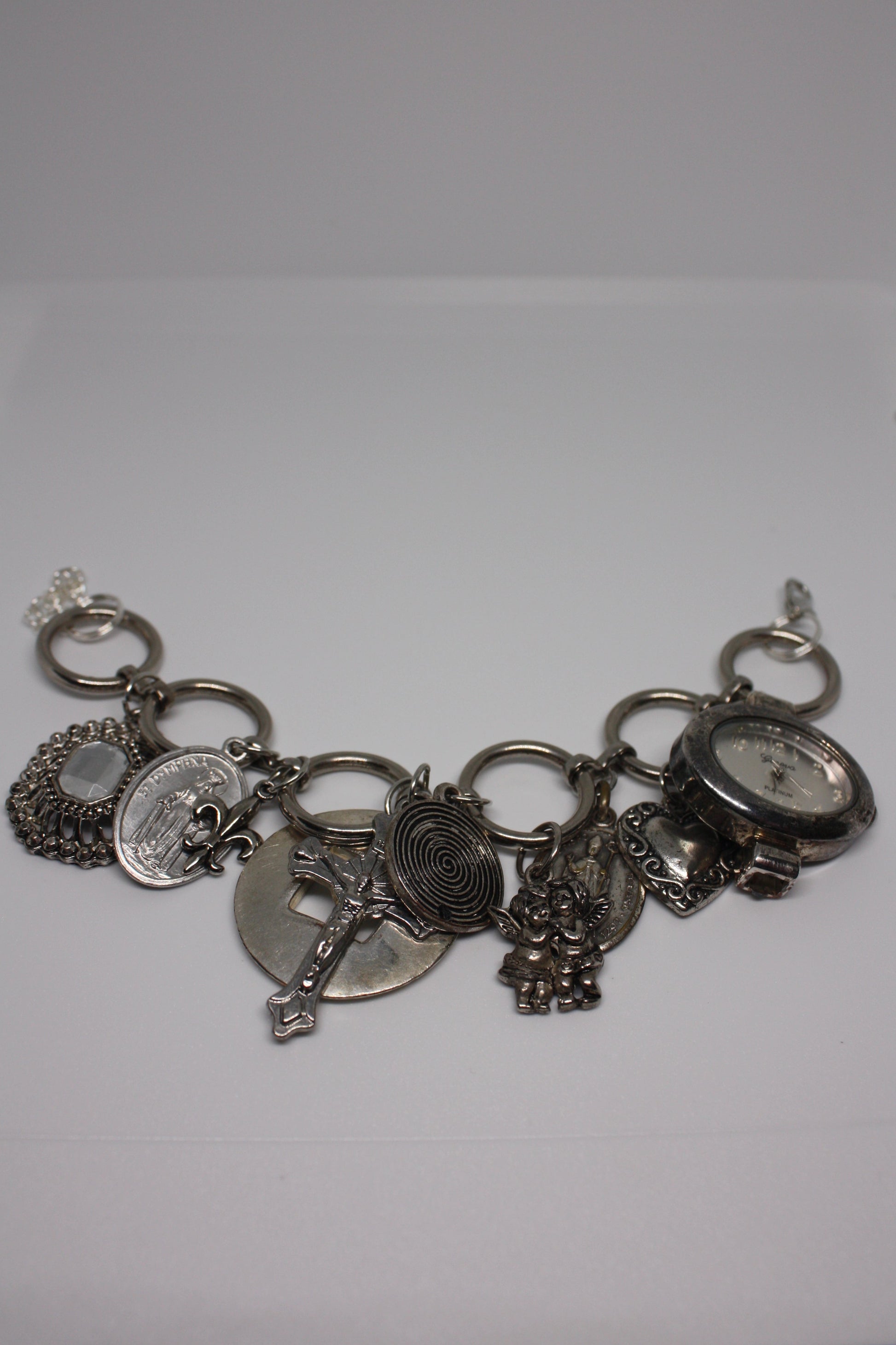 The Heavy Metal charm bracelet is a Vault favorite, featuring chunky religious charms, chunky abstract charms, and a bold watch face, layered onto a bold oversized chain link bracelet. This heavily charmed bracelet is a bold statement and completely iconic!