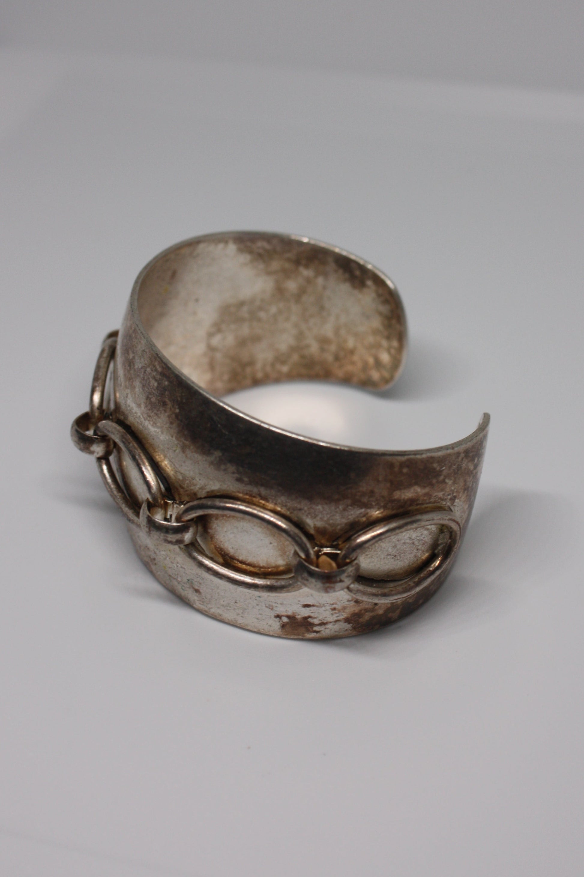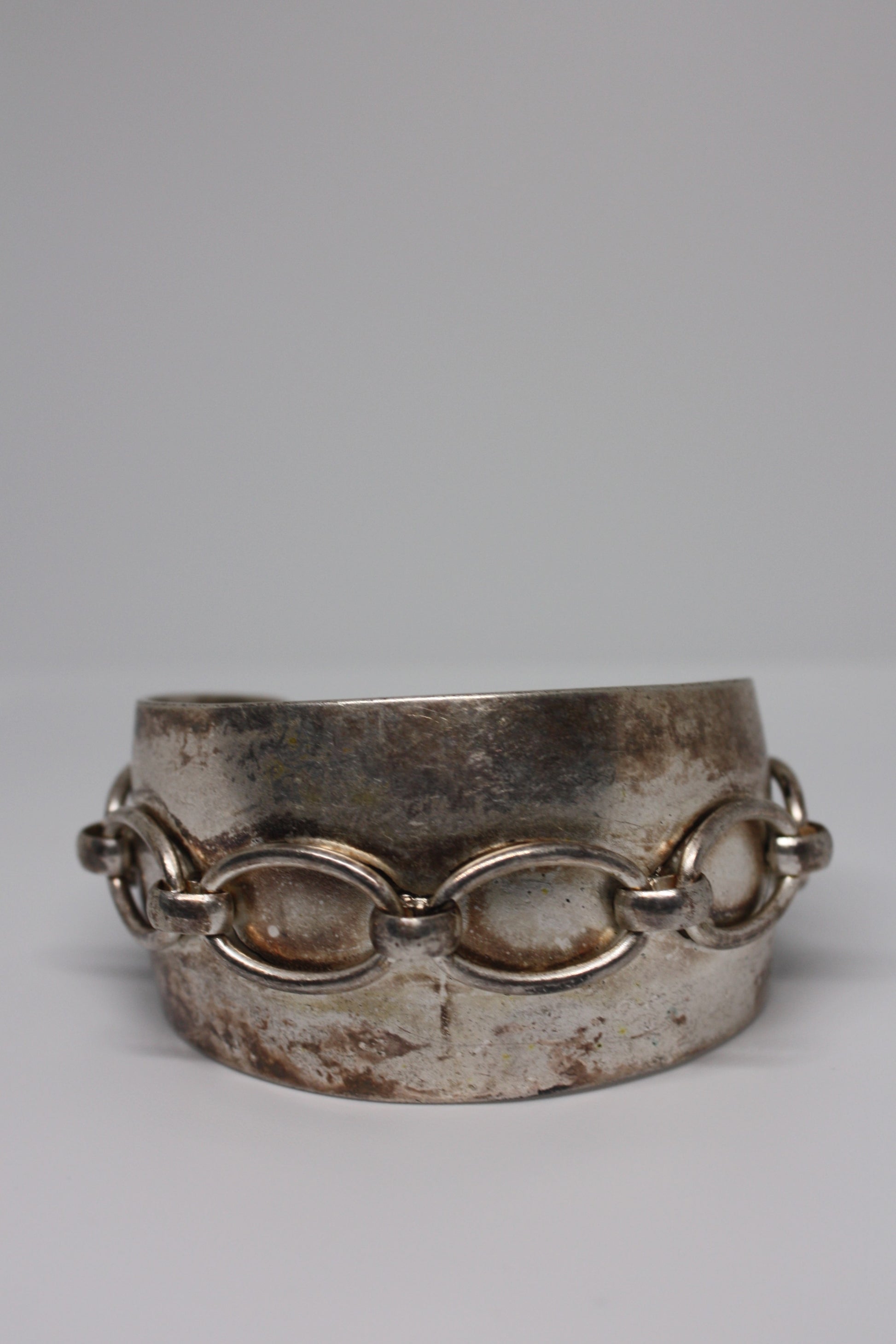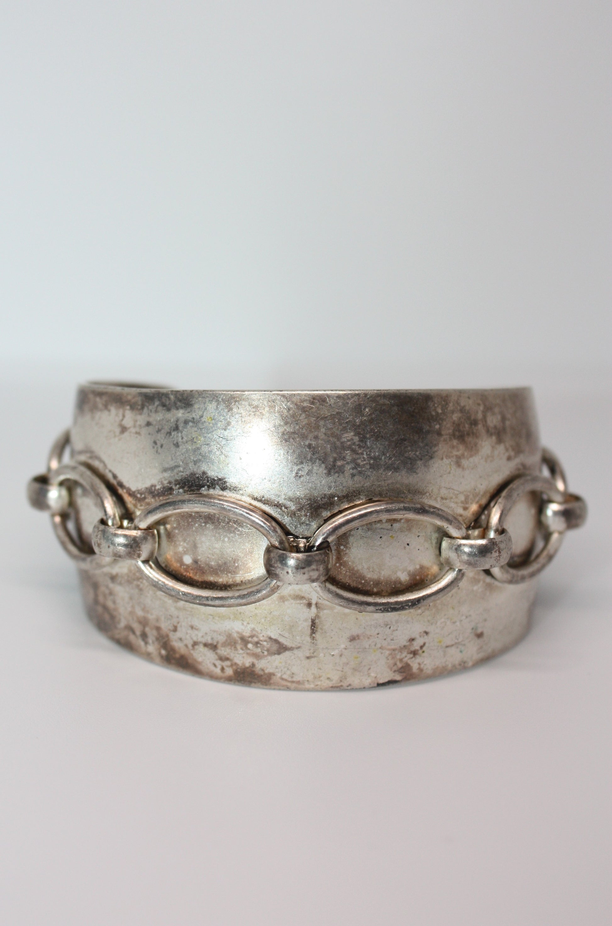 The Raw Link cuff is a gorgeous, bold, industrial-styled cuff with a cool raised chain link detailing. This vintage cuff brings raw energy to any look. This is such a fun layering piece, or to be worn solo as an edgy statement piece.