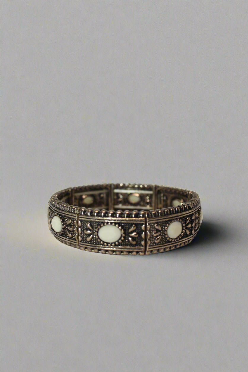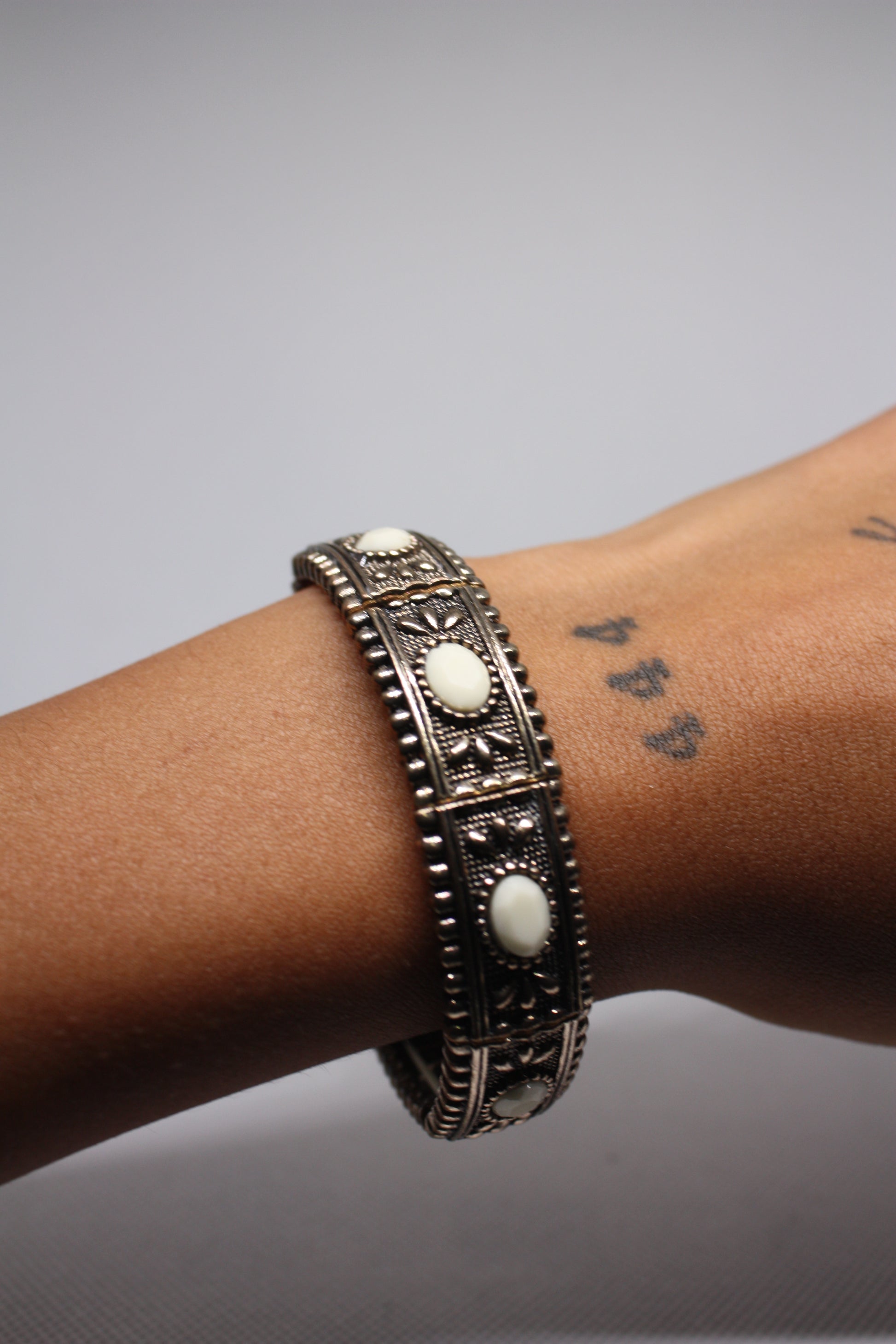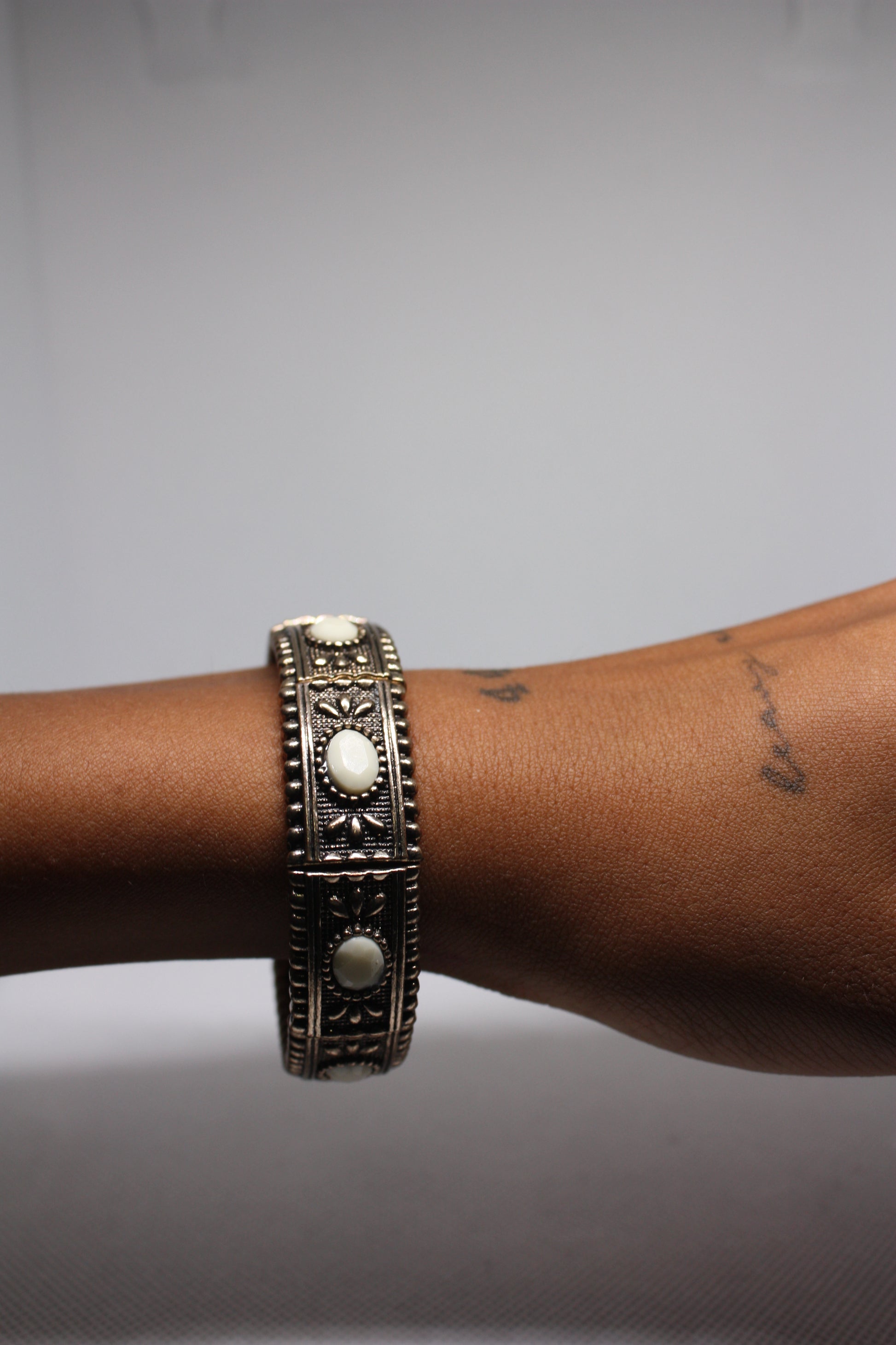This dark brass bracelet puts a grunge and glam twist in the Yacht Wreck collection. This stretchy bracelet is beautifully detailed and in perfect condition. From the detailing to ivory gems, this piece is such a statement and is super hot.