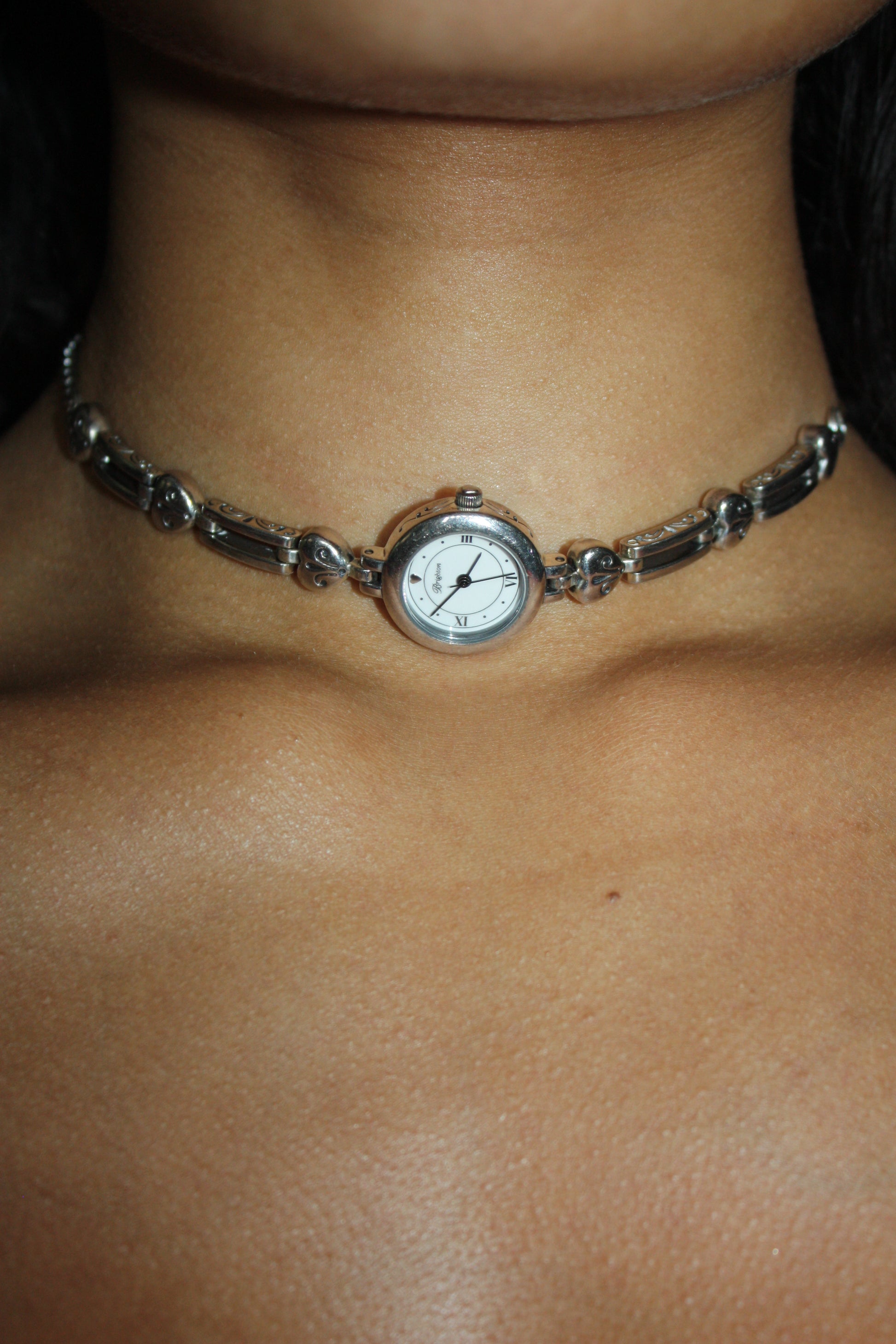 This watch choker is such a unique piece. The detailed etched hearts on the watch band, beautiful designed watch face and frame, and a once dainty and cute watch is now a bold, unique, statement choker!