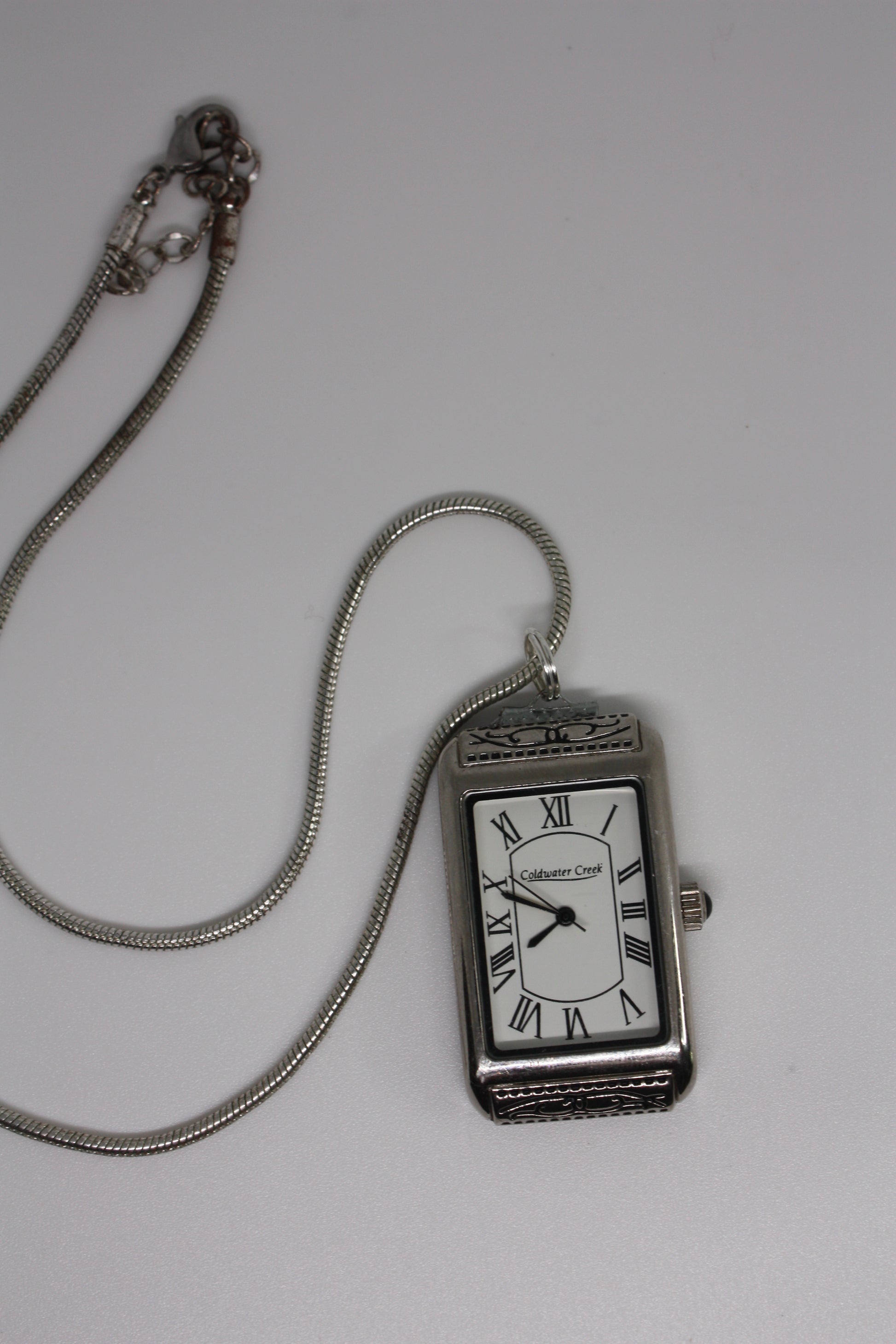 This up-cycled watch pendant features a rectangular watch face with gorgeous etched detailing, suspended from a sleek vintage chain. Roman Numeral numbering and ornate edges give such a timeless, chic look. Wear it stacked or solo, it's the perfect blend of statement yet simple.
