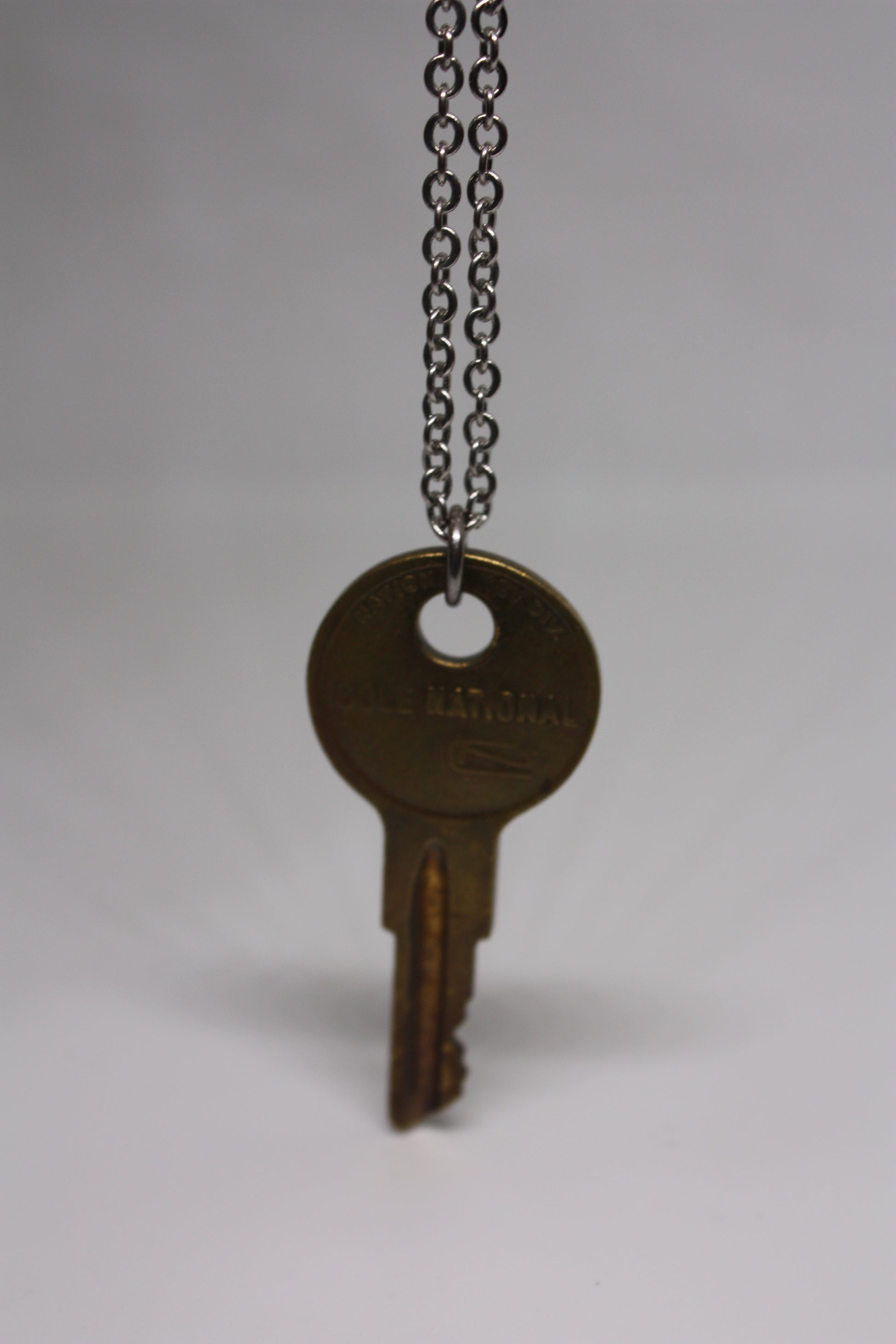 Edgy, minimal, and grunge. This necklace features a gold key suspended on a silver vintage sourced chain, with a raw and effortless look. Perfect for everyday wear, a grunge streetwear look, and makes for the most sick layering necklace! (back says "cole national", front says "B1" with a key etched, and Cleveland USA" in very small writing).